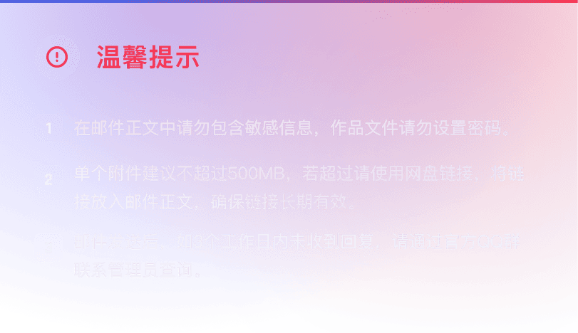 由于平台“创作者中心”后台正在建设中,本次大赛的作品上传暂采用人工审核+邮箱提交方式。